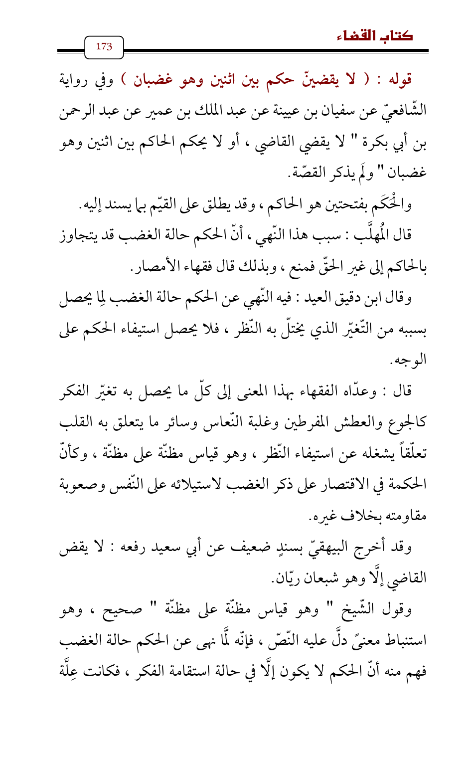 قوله: (لا يقضينّ حكم بين اثنين وهو غضبان) وفي رواية الشّافعيّ عن سفيان بن عيينة عن عبد الملك بن عمير عن عبد الرحمن بن أبي بكرة " لا يقضي القاضي , أو لا يحكم الحاكم بين اثنين وهو غضبان " ولَم يذكر القصّة.