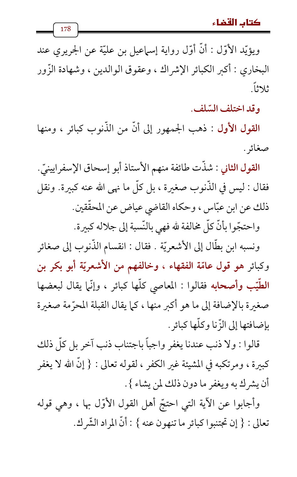ونسبه ابن بطّال إلى الأشعريّة. فقال: انقسام الذّنوب إلى صغائر وكبائر هو قول عامّة الفقهاء، وخالفهم من الأشعريّة أبو بكر بن الطّيّب وأصحابه فقالوا: المعاصي كلّها كبائر، وإنّما يقال لبعضها صغيرة بالإضافة إلى ما هو أكبر منها، كما يقال القبلة المحرّمة صغيرة بإضافتها إلى الزّنا وكلّها كبائر.