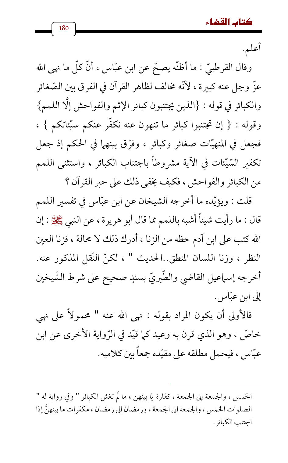 وقال القرطبيّ: ما أظنّه يصحّ عن ابن عبّاس , أنّ كلّ ما نهى الله عزّ وجل عنه كبيرة , لأنّه مخالف لظاهر القرآن في الفرق بين الصّغائر والكبائر في قوله: {الذين يجتنبون كبائر الإثم والفواحش إلَّا اللمم} وقوله: {إن تجتنبوا كبائر ما تنهون عنه نكفّر عنكم سيّئاتكم} , فجعل في المنهيّات صغائر وكبائر، وفرّق بينهما في الحكم إذ جعل تكفير السّيّئات في الآية مشروطاً باجتناب الكبائر، واستثنى اللمم من الكبائر والفواحش، فكيف يخفى ذلك على حبر القرآن؟