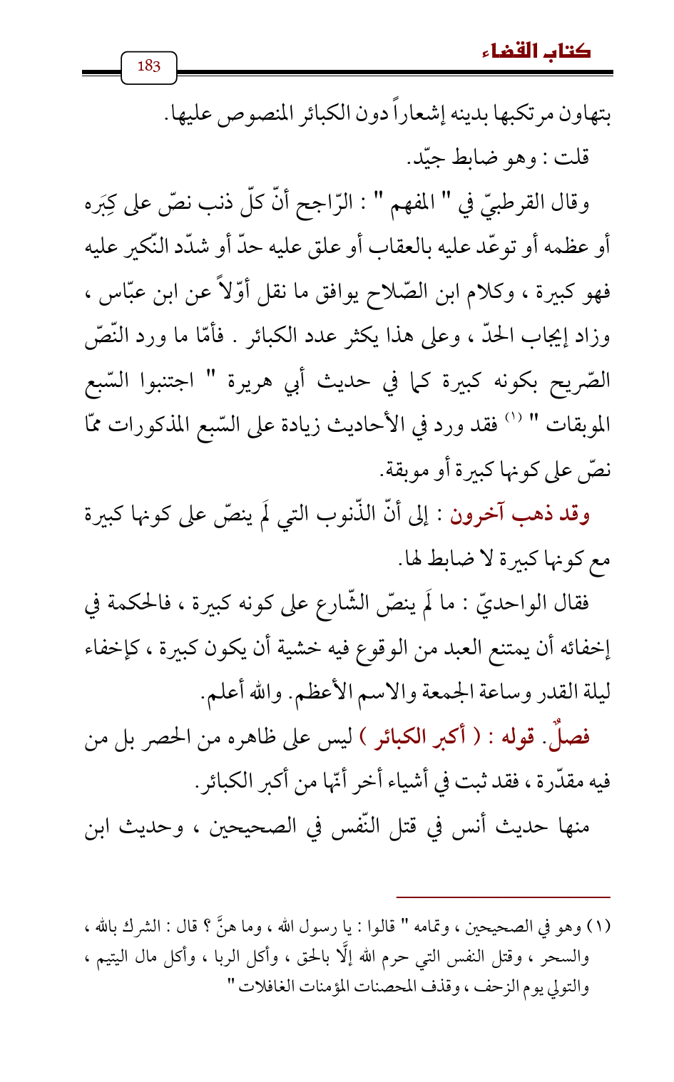 وقال القرطبيّ في " المفهم ": الرّاجح أنّ كلّ ذنب نصّ على كِبَره أو عظمه أو توعّد عليه بالعقاب أو علق عليه حدّ أو شدّد النّكير عليه فهو كبيرة، وكلام ابن الصّلاح يوافق ما نقل أوّلاً عن ابن عبّاس، وزاد إيجاب الحدّ، وعلى هذا يكثر عدد الكبائر. فأمّا ما ورد النّصّ الصّريح بكونه كبيرة كما في حديث أبي هريرة " اجتنبوا السّبع الموبقات " (¬1) فقد ورد في الأحاديث زيادة على السّبع المذكورات ممّا نصّ على كونها كبيرة أو موبقة.