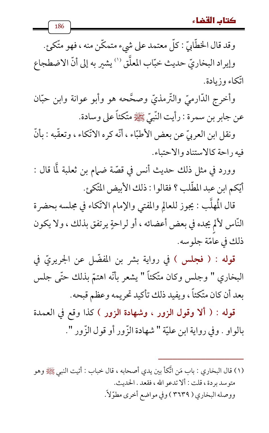 قال المُهلَّب: يجوز للعالِم والمفتي والإمام الاتّكاء في مجلسه بحضرة النّاس لألمٍ يجده في بعض أعضائه , أو لراحةٍ يرتفق بذلك , ولا يكون ذلك في عامّة جلوسه.