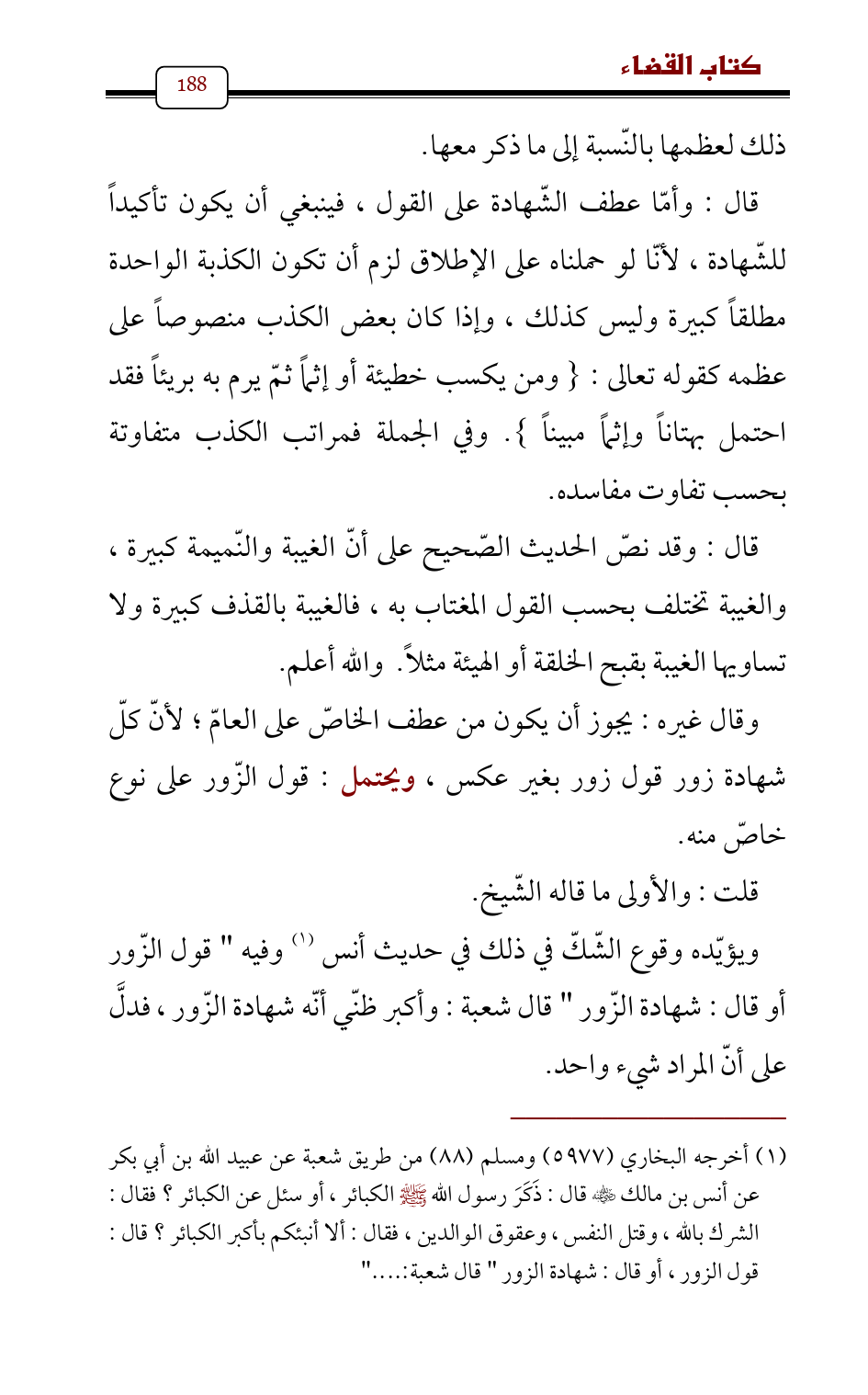 قال: وأمّا عطف الشّهادة على القول , فينبغي أن يكون تأكيداً للشّهادة , لأنّا لو حملناه على الإطلاق لزم أن تكون الكذبة الواحدة مطلقاً كبيرة وليس كذلك، وإذا كان بعض الكذب منصوصاً على عظمه كقوله تعالى: {ومن يكسب خطيئة أو إثماً ثمّ يرم به بريئاً فقد احتمل بهتاناً وإثماً مبيناً}. وفي الجملة فمراتب الكذب متفاوتة بحسب تفاوت مفاسده.