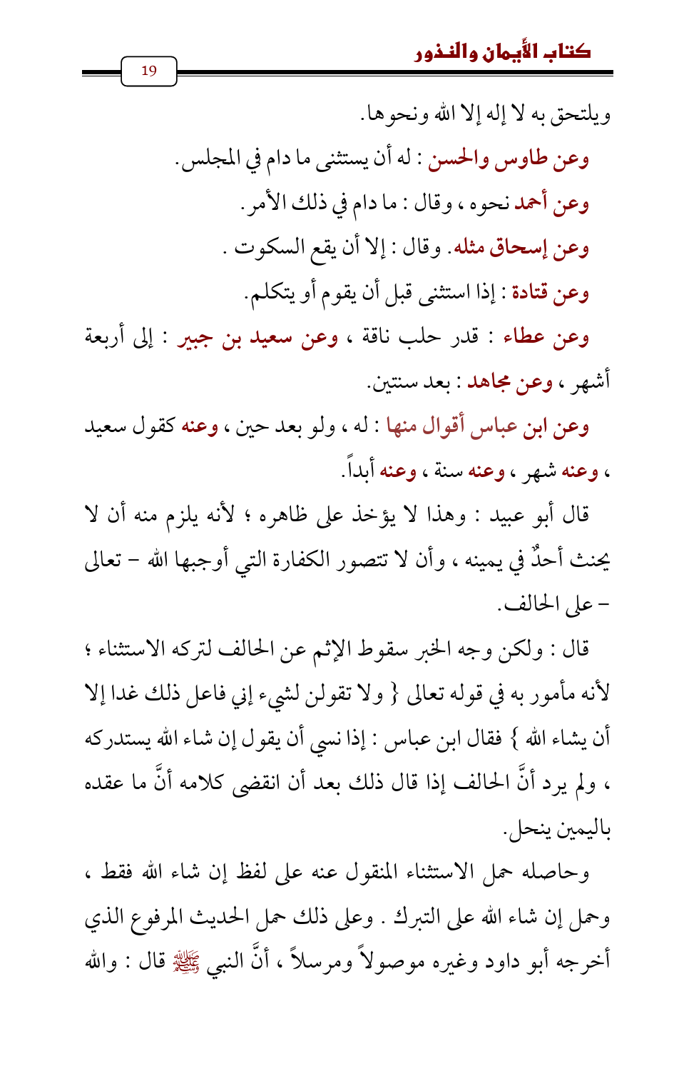 قال: ولكن وجه الخبر سقوط الإثم عن الحالف لتركه الاستثناء؛ لأنه مأمور به في قوله تعالى {ولا تقولن لشيء إني فاعل ذلك غدا إلا أن يشاء الله} فقال ابن عباس: إذا نسي أن يقول إن شاء الله يستدركه، ولم يرد أنَّ الحالف إذا قال ذلك بعد أن انقضى كلامه أنَّ ما عقده باليمين ينحل.