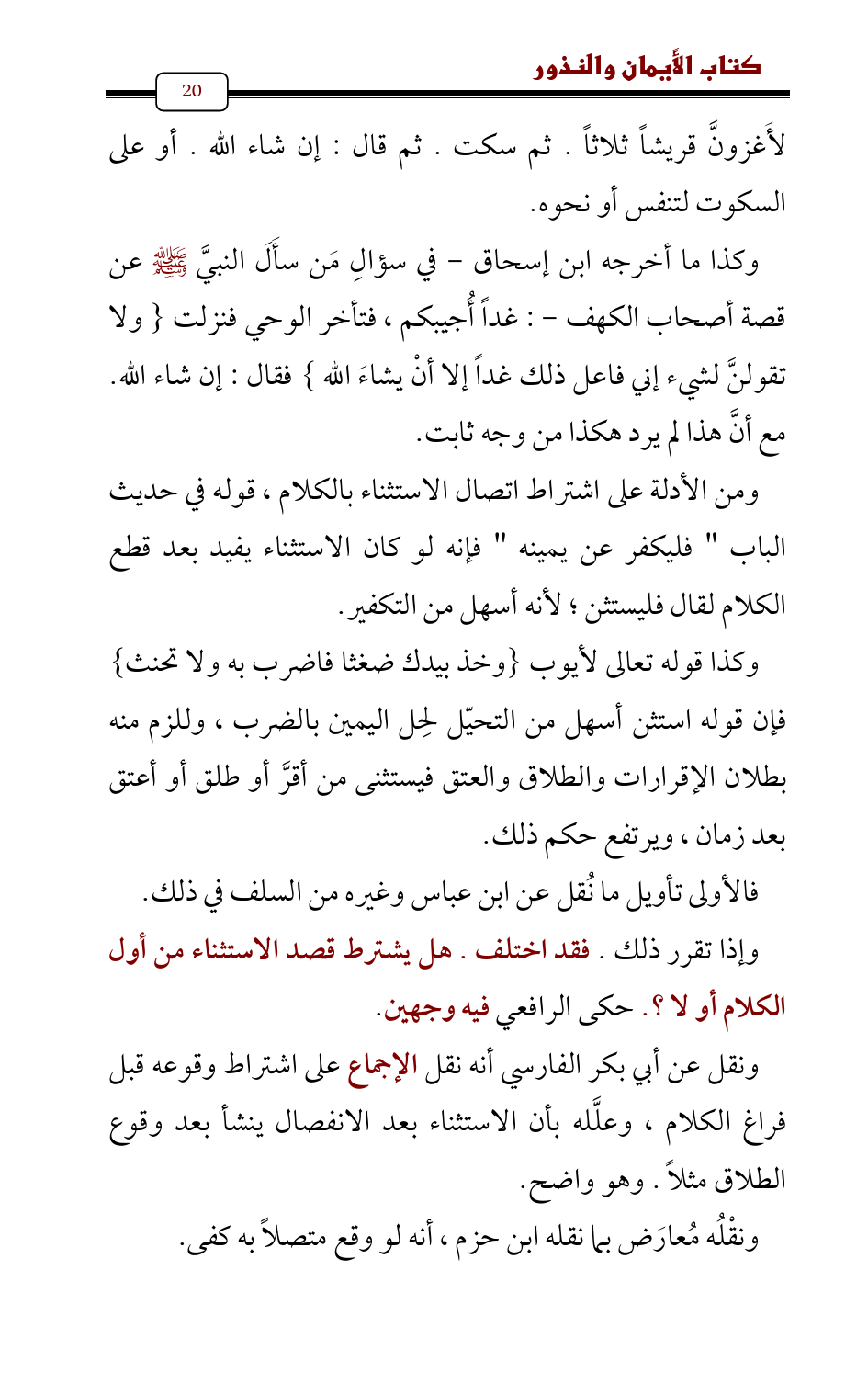 ومن الأدلة على اشتراط اتصال الاستثناء بالكلام , قوله في حديث الباب " فليكفر عن يمينه " فإنه لو كان الاستثناء يفيد بعد قطع الكلام لقال فليستثن؛ لأنه أسهل من التكفير.
