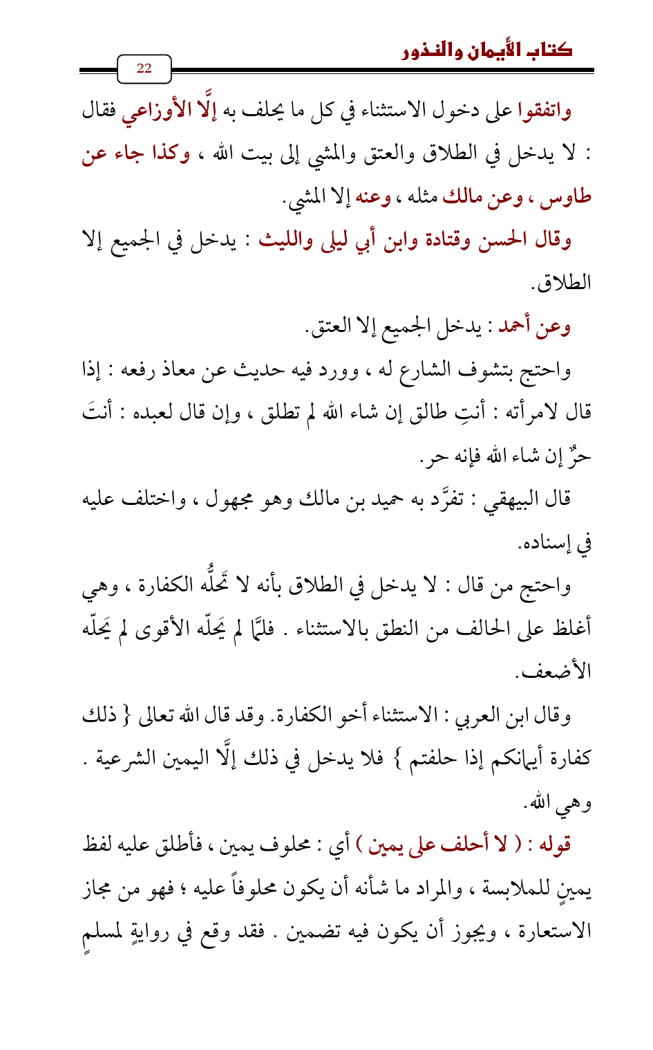 واتفقوا على دخول الاستثناء في كل ما يحلف به إلَّا الأوزاعي فقال: لا يدخل في الطلاق والعتق والمشي إلى بيت الله، وكذا جاء عن طاوس , وعن مالك مثله، وعنه إلا المشي.