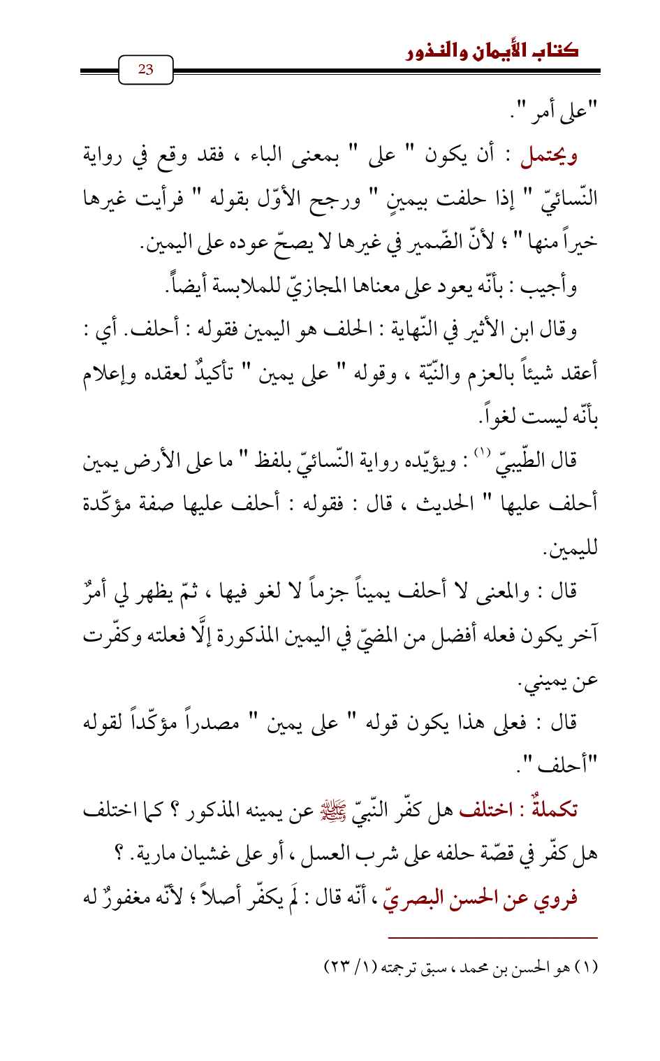 ويحتمل: أن يكون " على " بمعنى الباء، فقد وقع في رواية النّسائيّ " إذا حلفت بيمينٍ " ورجح الأوّل بقوله " فرأيت غيرها خيراً منها "؛ لأنّ الضّمير في غيرها لا يصحّ عوده على اليمين.