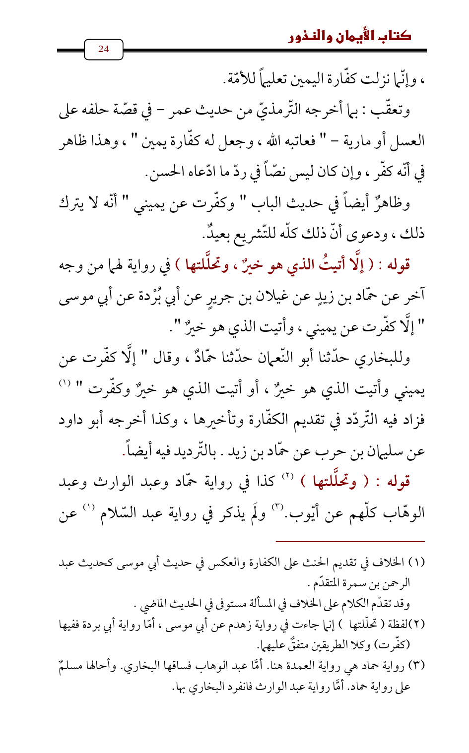 (¬2) لفظة (تحلّلتها) إنما جاءت في رواية زهدم عن أبي موسى , أمّا رواية أبي بردة ففيها (كفّرت) وكلا الطريقين متفقٌ عليهما.