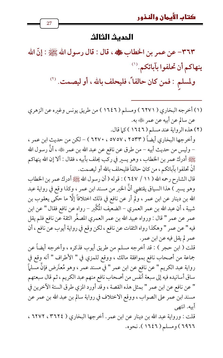 363 - عن عمر بن الخطاب - رضي الله عنه - , قال: قال رسول الله - صلى الله عليه وسلم -: إنّ الله ينهاكم أن تحلفوا بآبائكم. (¬1)