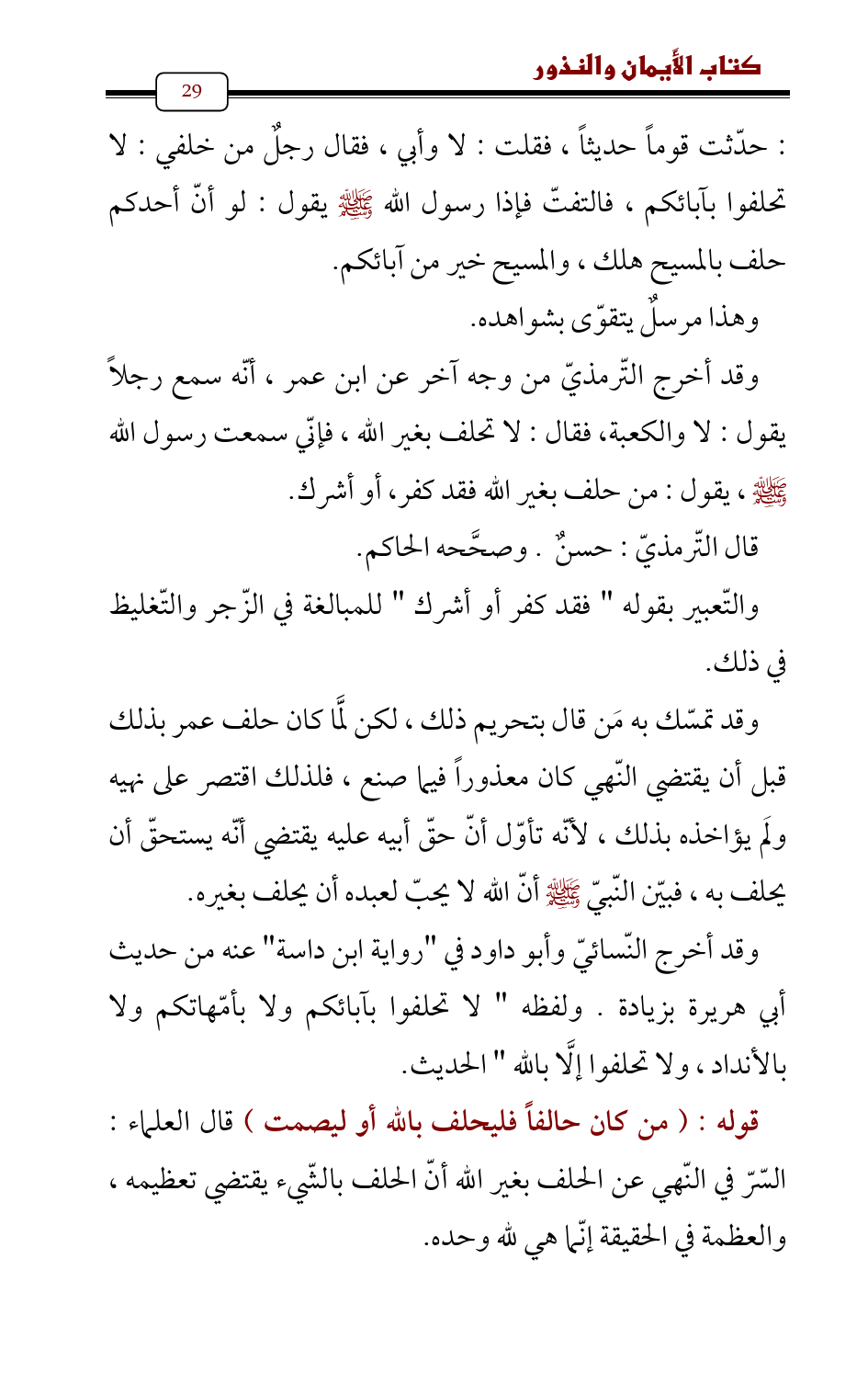 وقد أخرج التّرمذيّ من وجه آخر عن ابن عمر , أنّه سمع رجلاً يقول: لا والكعبة، فقال: لا تحلف بغير الله، فإنّي سمعت رسول الله - صلى الله عليه وسلم - , يقول: من حلف بغير الله فقد كفر، أو أشرك.