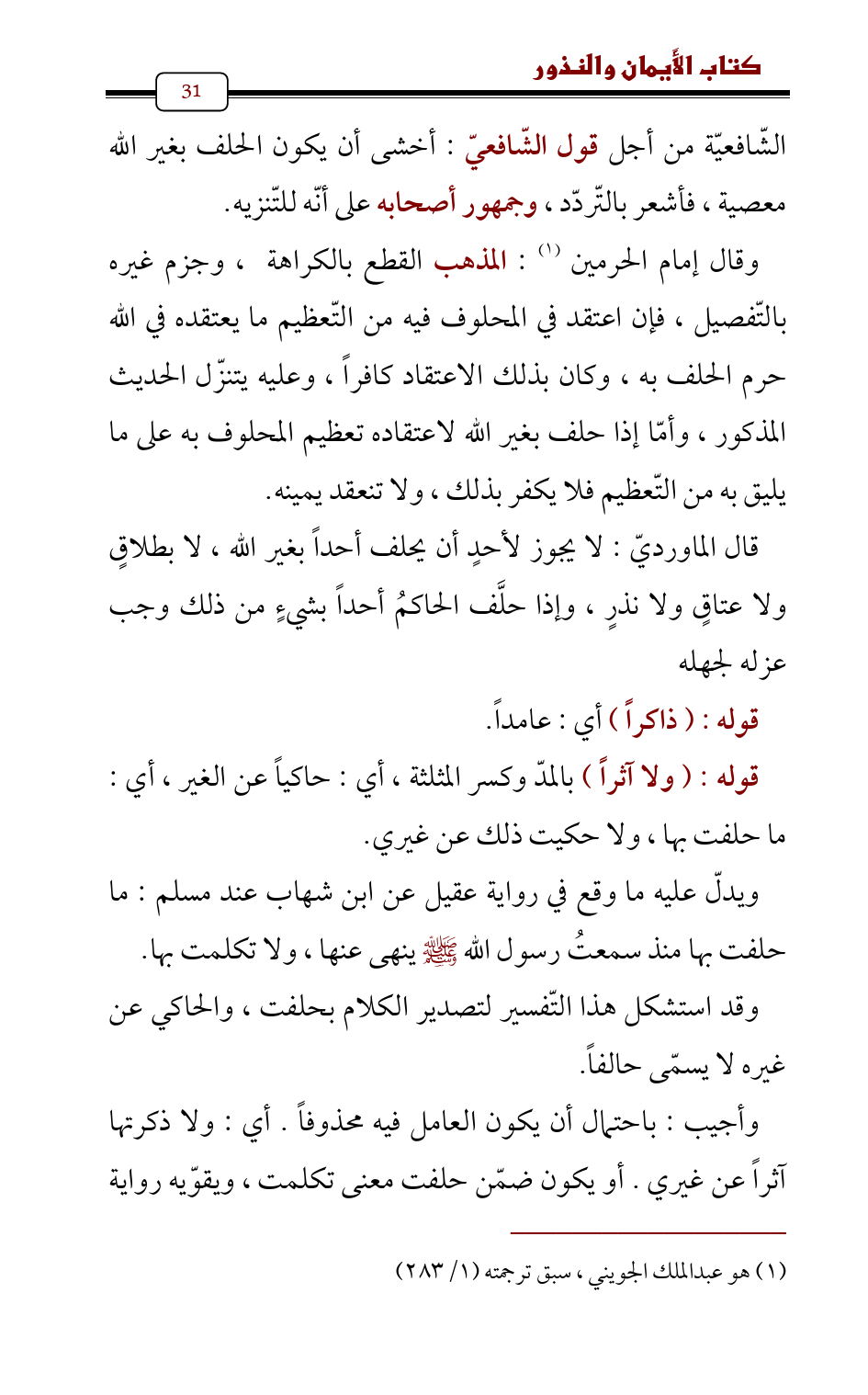 وقال إمام الحرمين (¬1): المذهب القطع بالكراهة، وجزم غيره بالتّفصيل، فإن اعتقد في المحلوف فيه من التّعظيم ما يعتقده في الله حرم الحلف به , وكان بذلك الاعتقاد كافراً، وعليه يتنزّل الحديث المذكور، وأمّا إذا حلف بغير الله لاعتقاده تعظيم المحلوف به على ما يليق به من التّعظيم فلا يكفر بذلك , ولا تنعقد يمينه.