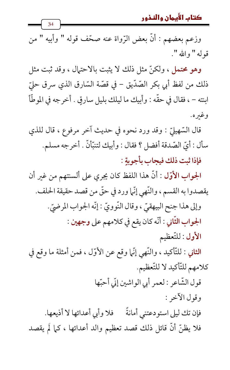وهو محتمل , ولكنّ مثل ذلك لا يثبت بالاحتمال، وقد ثبت مثل ذلك من لفظ أبي بكر الصّدّيق - في قصّة السّارق الذي سرق حليّ ابنته - , فقال في حقّه: وأبيك ما ليلك بليل سارقٍ. أخرجه في الموطّأ وغيره.