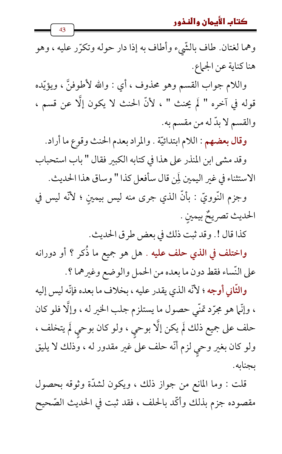 واللام جواب القسم وهو محذوف، أي: والله لأطوفنَّ، ويؤيّده قوله في آخره " لَم يحنث " , لأنّ الحنث لا يكون إلَّا عن قسم، والقسم لا بدّ له من مقسم به.