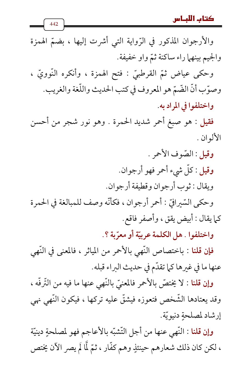 وإن قلنا: لا يختصّ بالأحمر فالمعنيّ بالنّهي عنها ما فيه من التّرفّه، وقد يعتادها الشّخص فتعوزه فيشقّ عليه تركها , فيكون النّهي نهي إرشاد لمصلحةٍ دنيويّة.