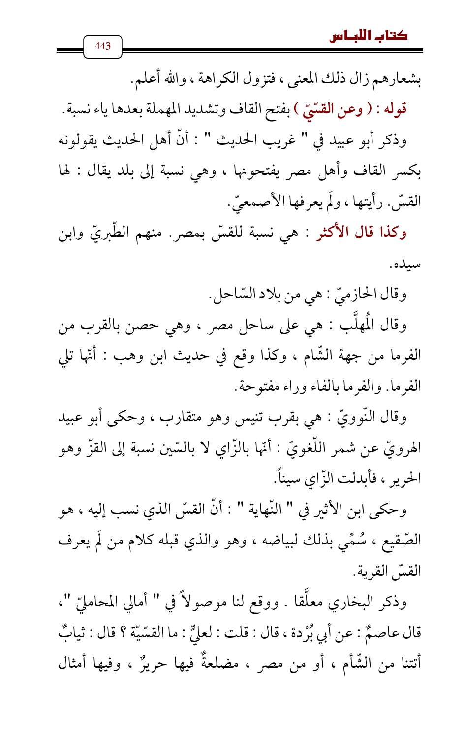 وذكر أبو عبيد في " غريب الحديث ": أنّ أهل الحديث يقولونه بكسر القاف وأهل مصر يفتحونها، وهي نسبة إلى بلد يقال: لها القسّ. رأيتها , ولَم يعرفها الأصمعيّ.