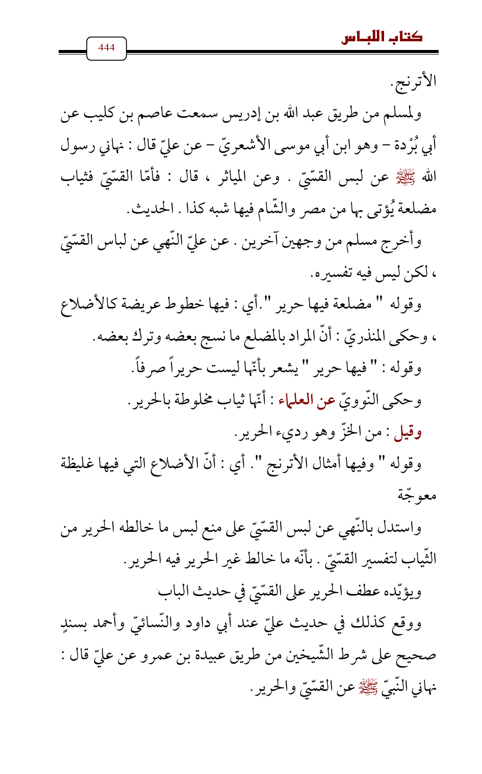 ولمسلم من طريق عبد الله بن إدريس سمعت عاصم بن كليب عن أبي بُرْدة - وهو ابن أبي موسى الأشعريّ - عن عليّ قال: نهاني رسول الله - صلى الله عليه وسلم - عن لبس القسّيّ. وعن المياثر، قال: فأمّا القسّيّ فثياب مضلعة يُؤتى بها من مصر والشّام فيها شبه كذا. الحديث.