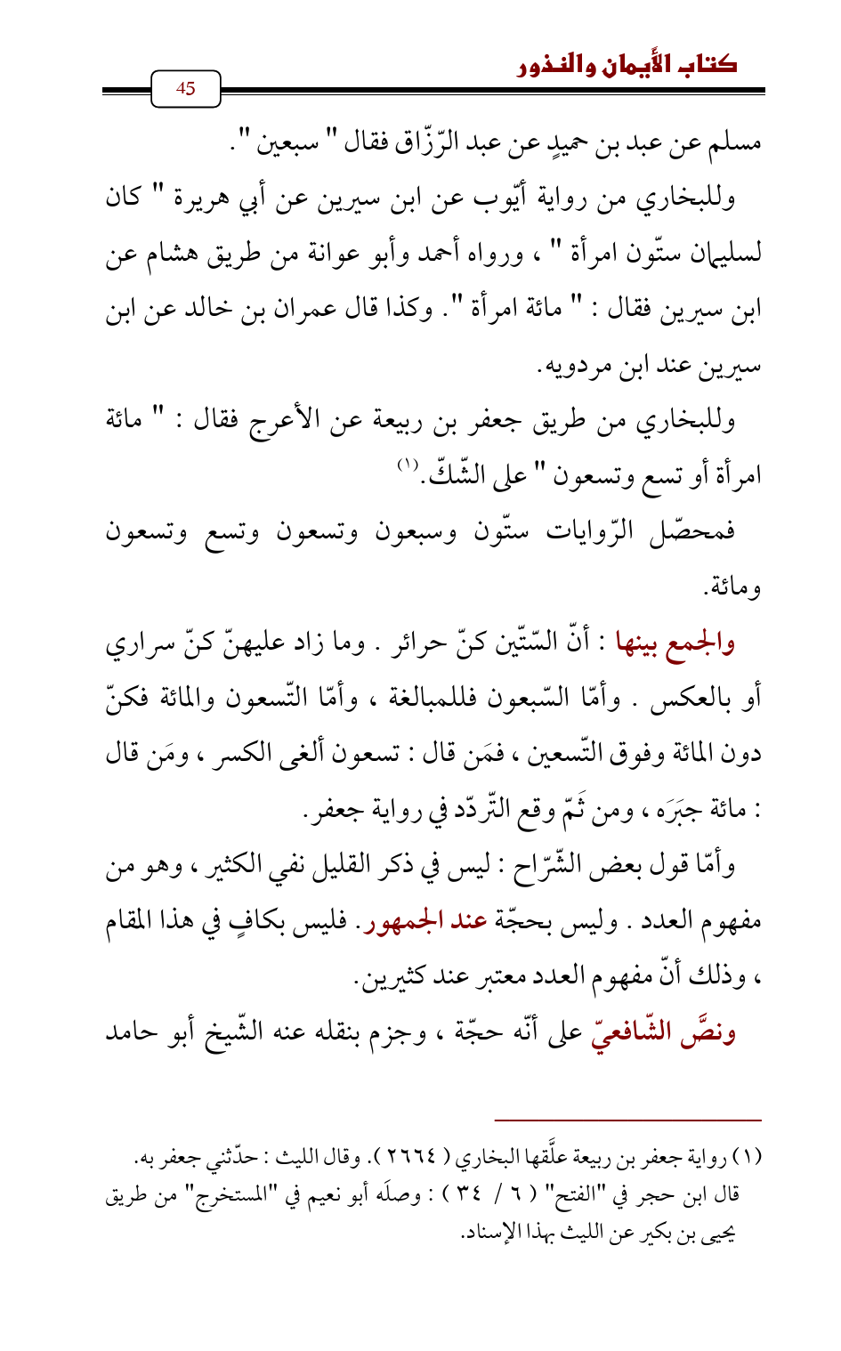 والجمع بينها: أنّ السّتّين كنّ حرائر. وما زاد عليهنّ كنّ سراري أو بالعكس. وأمّا السّبعون فللمبالغة، وأمّا التّسعون والمائة فكنّ دون المائة وفوق التّسعين , فمَن قال: تسعون ألغى الكسر , ومَن قال: مائة جبَرَه , ومن ثَمّ وقع التّردّد في رواية جعفر.