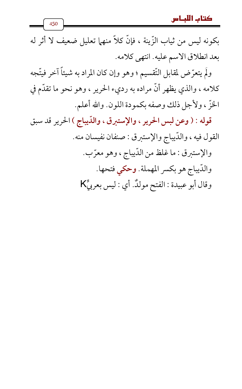 بكونه ليس من ثياب الزّينة , فإنّ كلاً منهما تعليل ضعيف لا أثر له بعد انطلاق الاسم عليه. انتهى كلامه.