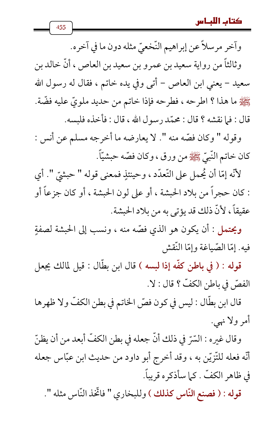 قال ابن بطّال: ليس في كون فصّ الخاتم في بطن الكفّ ولا ظهرها أمر ولا نهي.