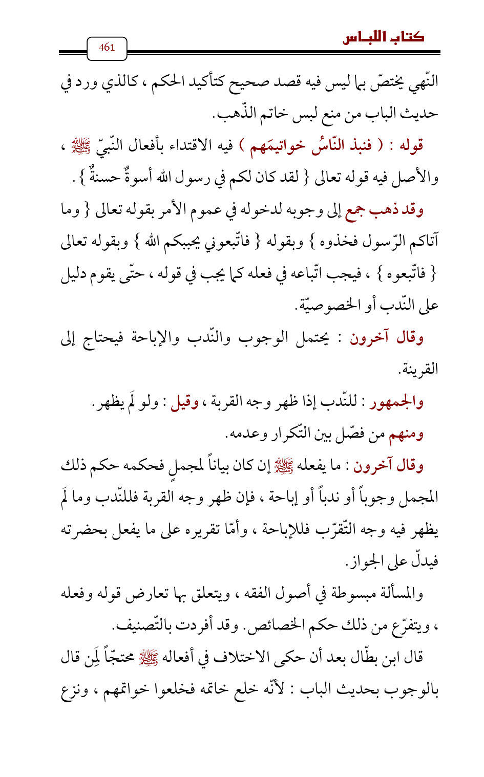 قال ابن بطّال بعد أن حكى الاختلاف في أفعاله - صلى الله عليه وسلم - محتجّاً لِمَن قال بالوجوب بحديث الباب: لأنّه خلع خاتمه فخلعوا خواتمهم، ونزع