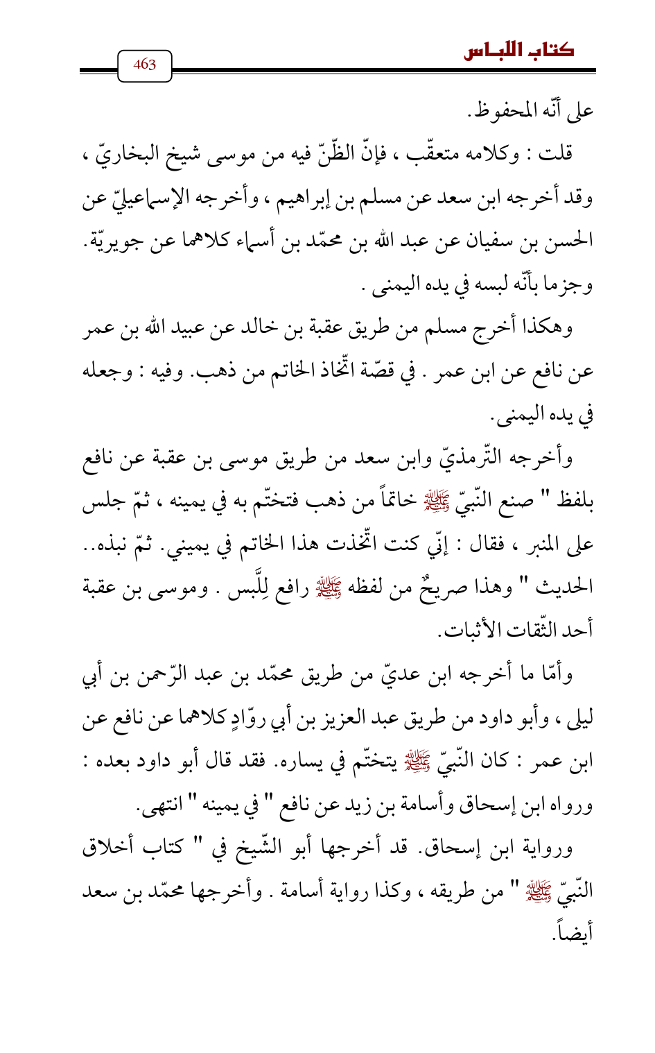 وأخرجه التّرمذيّ وابن سعد من طريق موسى بن عقبة عن نافع بلفظ " صنع النّبيّ - صلى الله عليه وسلم - خاتماً من ذهب فتختّم به في يمينه، ثمّ جلس على المنبر , فقال: إنّي كنت اتّخذت هذا الخاتم في يميني. ثمّ نبذه .. الحديث " وهذا صريحٌ من لفظه - صلى الله عليه وسلم - رافع لِلَّبس. وموسى بن عقبة أحد الثّقات الأثبات.