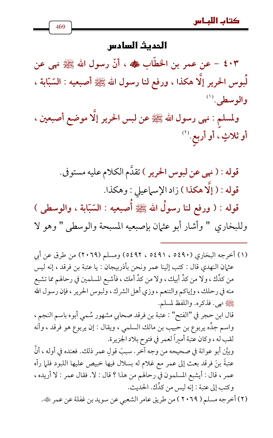 403 - عن عمر بن الخطّاب - رضي الله عنه - , أنّ رسول الله - صلى الله عليه وسلم - نهى عن لُبوس الحرير إلَّا هكذا , ورفع لنا رسول الله - صلى الله عليه وسلم - أصبعيه: السّبّابة , والوسطى. (¬1)