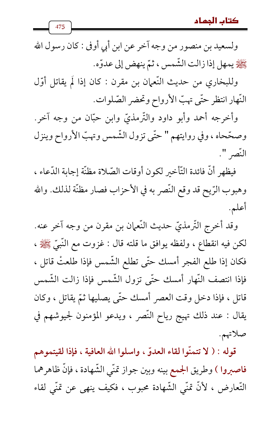 وقد أخرج التّرمذيّ حديث النّعمان بن مقرن من وجه آخر عنه. لكن فيه انقطاع، ولفظه يوافق ما قلته قال: غزوت مع النّبيّ - صلى الله عليه وسلم - , فكان إذا طلع الفجر أمسك حتّى تطلع الشّمس فإذا طلعتْ قاتل، فإذا انتصف النّهار أمسك حتّى تزول الشّمس فإذا زالت الشّمس قاتل، فإذا دخل وقت العصر أمسك حتّى يصليها ثمّ يقاتل، وكان يقال: عند ذلك تهيج رياح النّصر , ويدعو المؤمنون لجيوشهم في صلاتهم.