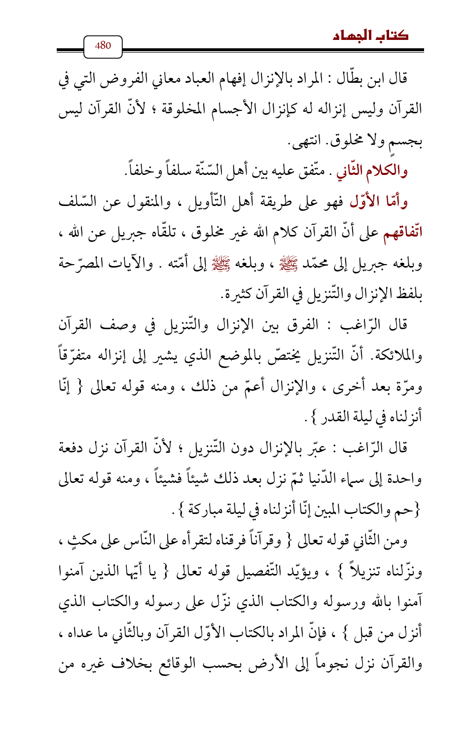 وأمّا الأوّل فهو على طريقة أهل التّأويل، والمنقول عن السّلف اتّفاقهم على أنّ القرآن كلام الله غير مخلوق، تلقّاه جبريل عن الله , وبلغه جبريل إلى محمّد - صلى الله عليه وسلم - , وبلغه - صلى الله عليه وسلم - إلى أمّته. والآيات المصرّحة بلفظ الإنزال والتّنزيل في القرآن كثيرة.