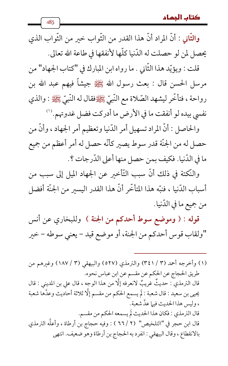 والحاصل: أنّ المراد تسهيل أمر الدّنيا وتعظيم أمر الجهاد، وأنّ من حصل له من الجنّة قدر سوط يصير كأنّه حصل له أمر أعظم من جميع ما في الدّنيا. فكيف بمن حصل منها أعلى الدّرجات؟.