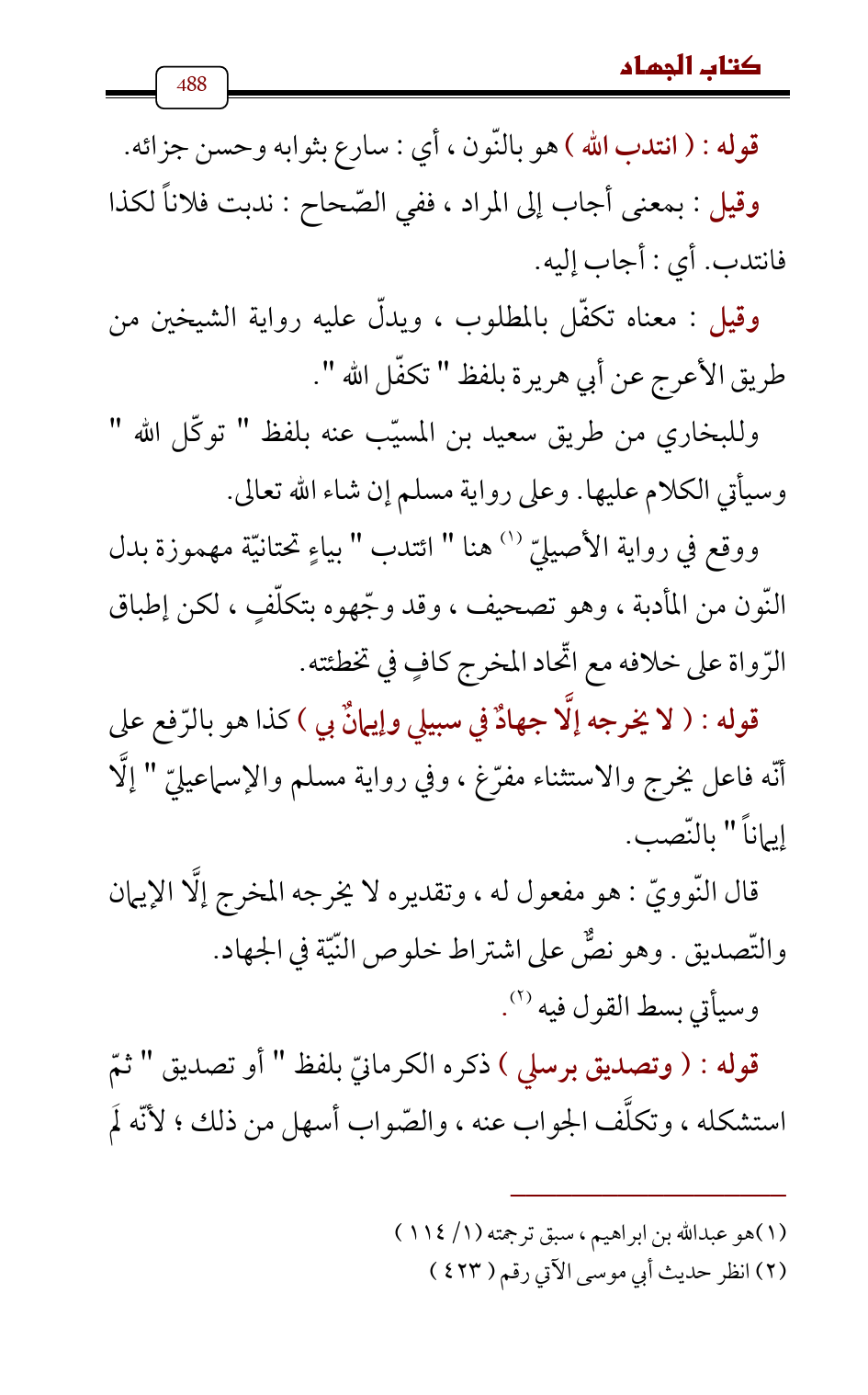 قوله: (لا يخرجه إلَّا جهادٌ في سبيلي وإيمانٌ بي) كذا هو بالرّفع على أنّه فاعل يخرج والاستثناء مفرّغ، وفي رواية مسلم والإسماعيليّ " إلَّا إيماناً " بالنّصب.