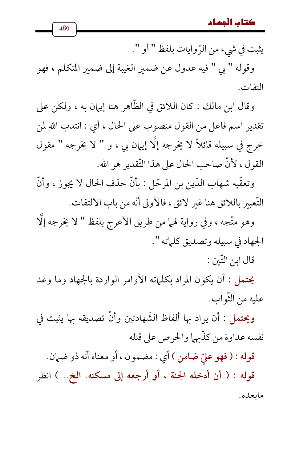 وهو متّجه، وفي رواية لهما من طريق الأعرج بلفظ " لا يخرجه إلَّا الجهاد في سبيله وتصديق كلماته ".