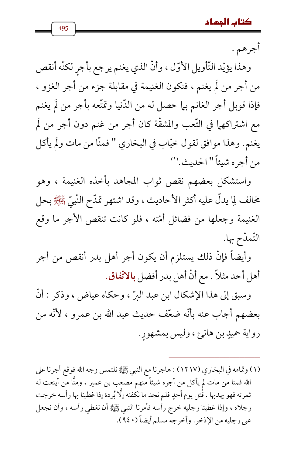 وهذا يؤيّد التّأويل الأوّل , وأنّ الذي يغنم يرجع بأجرٍ لكنّه أنقص من أجر من لَم يغنم، فتكون الغنيمة في مقابلة جزء من أجر الغزو، فإذا قوبل أجر الغانم بما حصل له من الدّنيا وتمتّعه بأجر من لَم يغنم مع اشتراكهما في التّعب والمشقّة كان أجر من غنم دون أجر من لَم يغنم. وهذا موافق لقول خبّاب في البخاري " فمنّا من مات ولَم يأكل من أجره شيئاً " الحديث. (¬1)