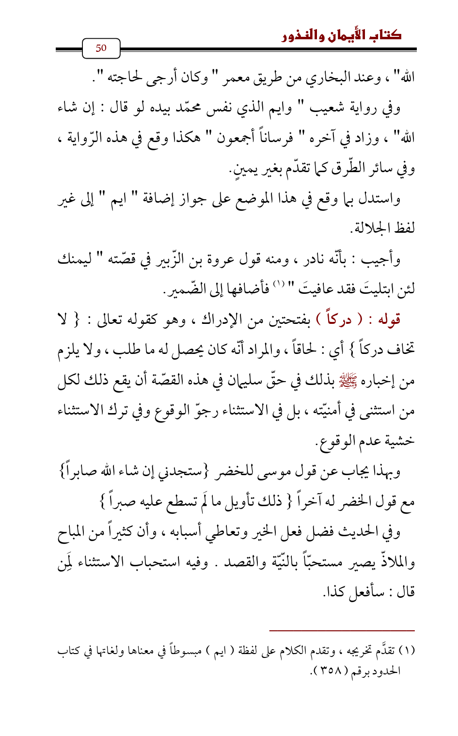 قوله: (دركاً) بفتحتين من الإدراك , وهو كقوله تعالى: {لا تخاف دركاً} أي: لحاقاً، والمراد أنّه كان يحصل له ما طلب , ولا يلزم من إخباره - صلى الله عليه وسلم - بذلك في حقّ سليمان في هذه القصّة أن يقع ذلك لكل من استثنى في أمنيّته، بل في الاستثناء رجوّ الوقوع وفي ترك الاستثناء خشية عدم الوقوع.