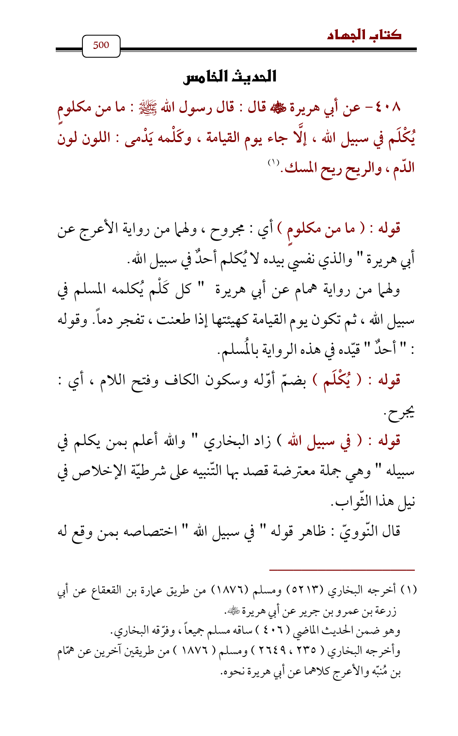 408 - عن أبي هريرة - رضي الله عنه - قال: قال رسول الله - صلى الله عليه وسلم -: ما من مكلومٍ يُكْلَم في سبيل الله، إلَّا جاء يوم القيامة، وكَلْمه يَدْمى: اللون لون الدّم، والريح ريح المسك. (¬1)