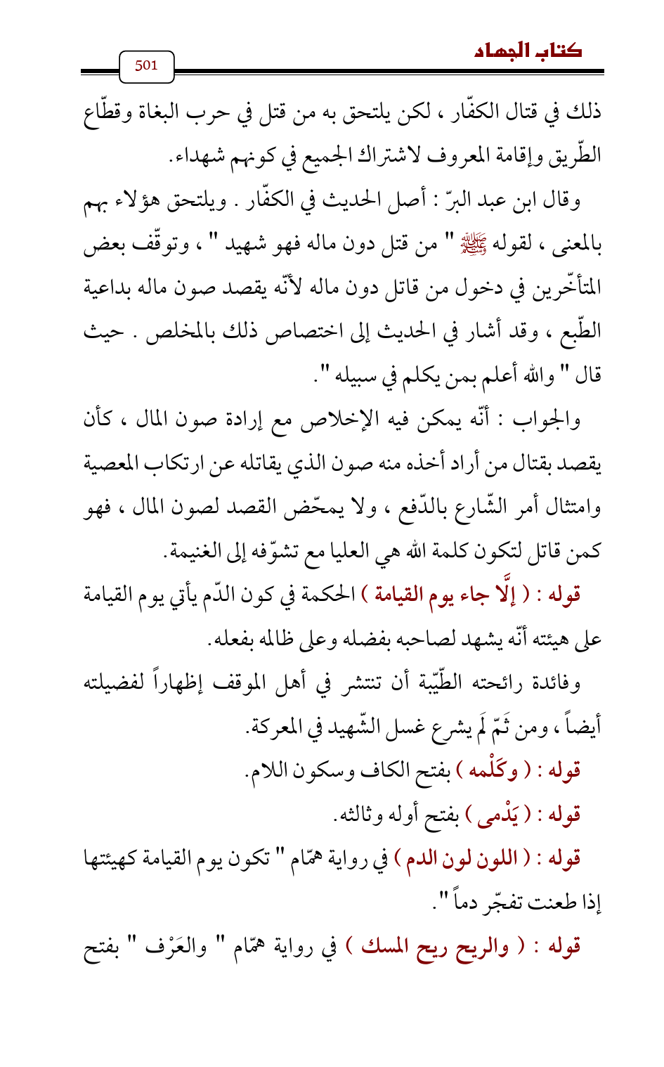 وقال ابن عبد البرّ: أصل الحديث في الكفّار. ويلتحق هؤلاء بهم بالمعنى، لقوله - صلى الله عليه وسلم - " من قتل دون ماله فهو شهيد " , وتوقّف بعض المتأخّرين في دخول من قاتل دون ماله لأنّه يقصد صون ماله بداعية الطّبع، وقد أشار في الحديث إلى اختصاص ذلك بالمخلص. حيث قال " والله أعلم بمن يكلم في سبيله ".
