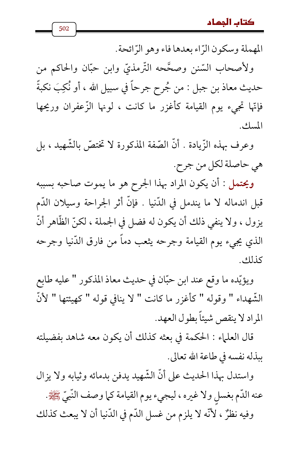 ويحتمل: أن يكون المراد بهذا الجرح هو ما يموت صاحبه بسببه قبل اندماله لا ما يندمل في الدّنيا. فإنّ أثر الجراحة وسيلان الدّم يزول، ولا ينفي ذلك أن يكون له فضل في الجملة، لكنّ الظّاهر أنّ الذي يجيء يوم القيامة وجرحه يثعب دماً من فارق الدّنيا وجرحه كذلك.