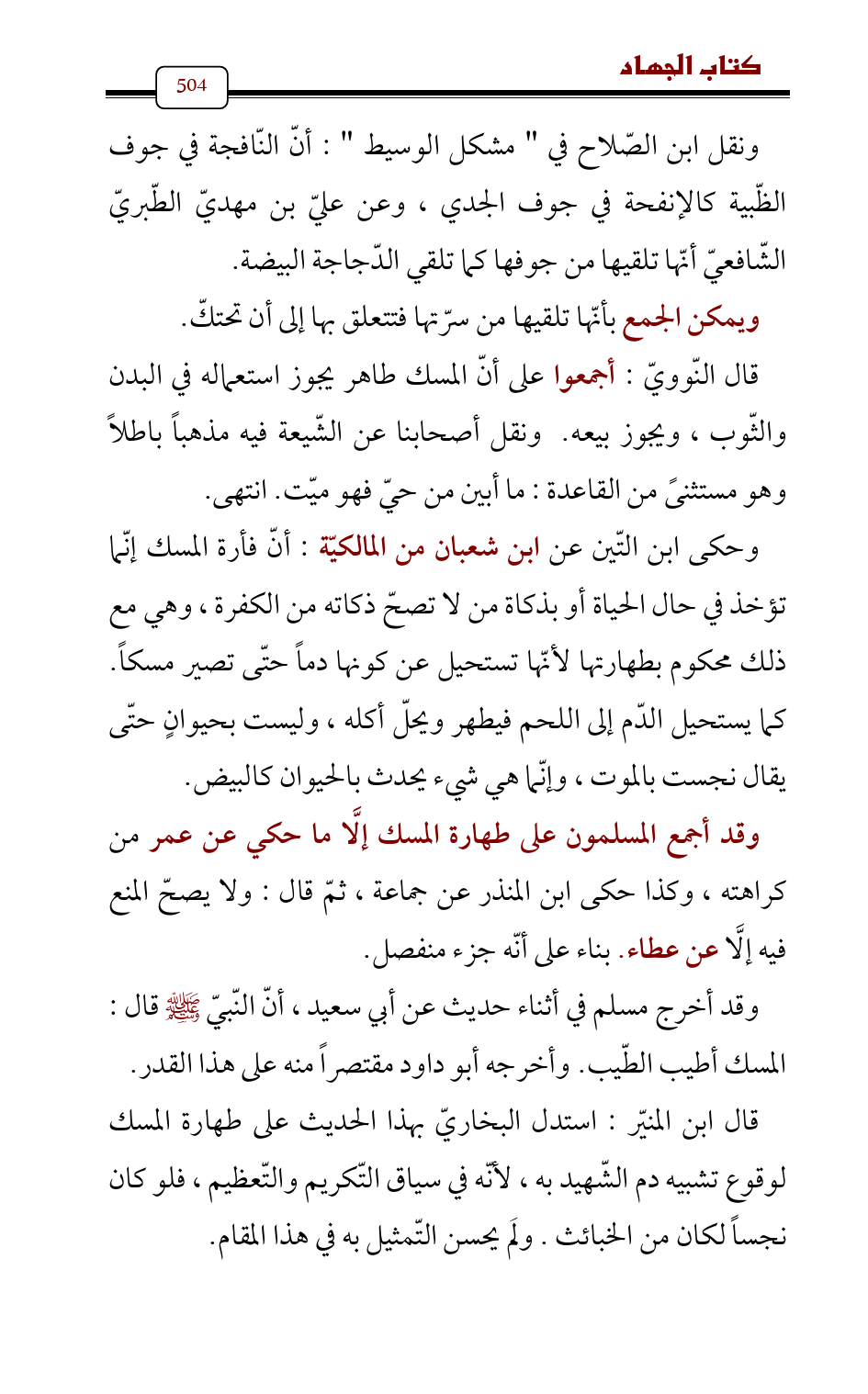 قال ابن المنيّر: استدل البخاريّ بهذا الحديث على طهارة المسك لوقوع تشبيه دم الشّهيد به، لأنّه في سياق التّكريم والتّعظيم، فلو كان نجساً لكان من الخبائث. ولَم يحسن التّمثيل به في هذا المقام.