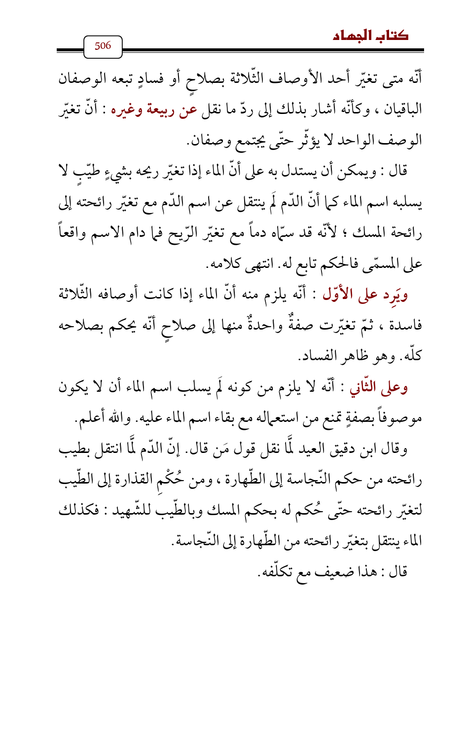 قال: ويمكن أن يستدل به على أنّ الماء إذا تغيّر ريحه بشيءٍ طيّبٍ لا يسلبه اسم الماء كما أنّ الدّم لَم ينتقل عن اسم الدّم مع تغيّر رائحته إلى رائحة المسك؛ لأنّه قد سمّاه دماً مع تغيّر الرّيح فما دام الاسم واقعاً على المسمّى فالحكم تابع له. انتهى كلامه.