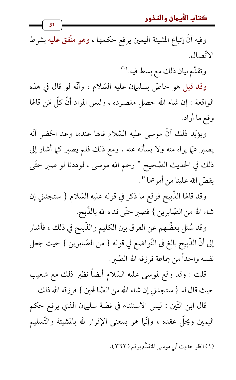 قال ابن التّين: ليس الاستثناء في قصّة سليمان الذي يرفع حكم اليمين ويحلّ عقده، وإنّما هو بمعنى الإقرار لله بالمشيئة والتّسليم