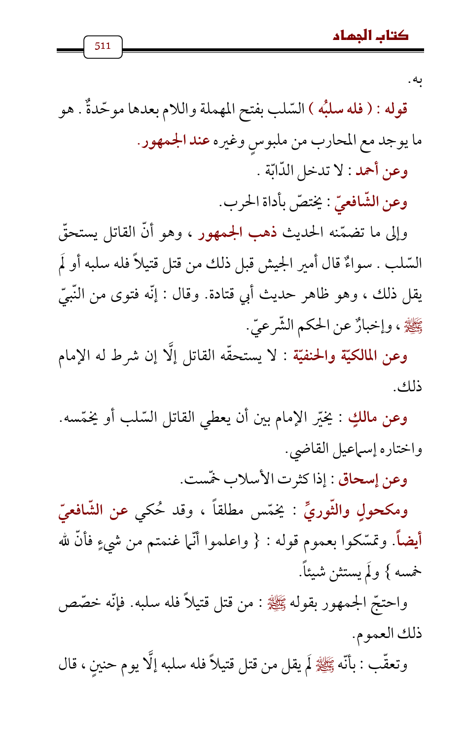 وإلى ما تضمّنه الحديث ذهب الجمهور، وهو أنّ القاتل يستحقّ السّلب. سواءٌ قال أمير الجيش قبل ذلك من قتل قتيلاً فله سلبه أو لَم يقل ذلك، وهو ظاهر حديث أبي قتادة. وقال: إنّه فتوى من النّبيّ - صلى الله عليه وسلم - , وإخبارٌ عن الحكم الشّرعيّ.