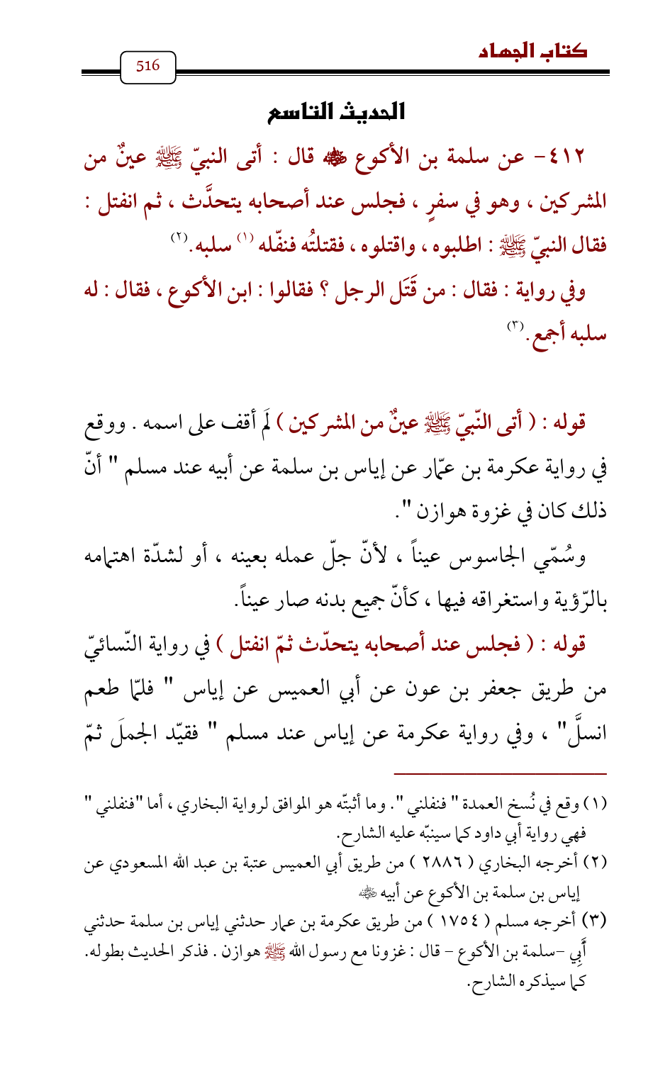 412 - عن سلمة بن الأكوع - رضي الله عنه - قال: أتى النبيّ - صلى الله عليه وسلم - عينٌ من المشركين، وهو في سفرٍ، فجلس عند أصحابه يتحدَّث، ثم انفتل: فقال النبيّ - صلى الله عليه وسلم -: اطلبوه، واقتلوه، فقتلتُه فنفّله (¬1) سلبه. (¬2)