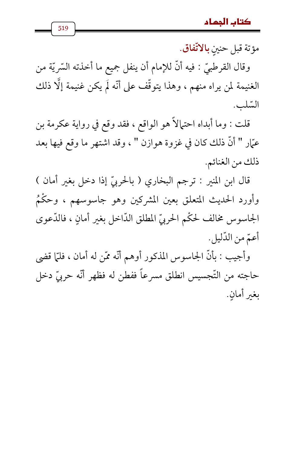 قال ابن المنير: ترجم البخاري (بالحربيّ إذا دخل بغير أمان) وأورد الحديث المتعلق بعين المشركين وهو جاسوسهم، وحكْمُ الجاسوس مخالف لحكْم الحربيّ المطلق الدّاخل بغير أمانٍ، فالدّعوى أعمّ من الدّليل.