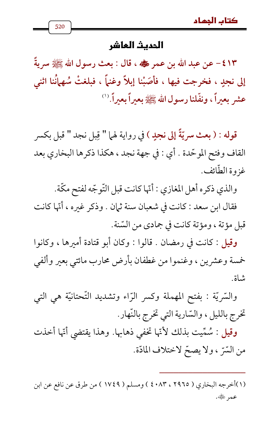413 - عن عبد الله بن عمر - رضي الله عنه -، قال: بعث رسول الله - صلى الله عليه وسلم - سريةً إلى نجدٍ، فخرجت فيها، فأصَبْنا إبلاً وغنماً، فبلغتْ سُهمانُنا اثني عشر بعيراً، ونفّلنا رسول الله - صلى الله عليه وسلم - بعيراً بعيراً. (¬1)