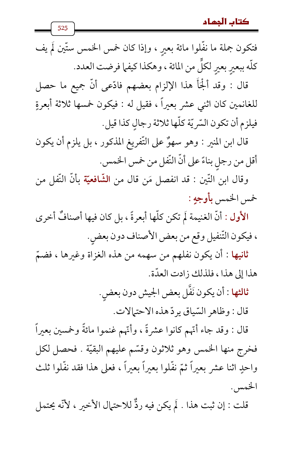 قال: وقد ألْجَأَ هذا الإلزام بعضهم فادّعى أنّ جميع ما حصل للغانمين كان اثني عشر بعيراً , فقيل له: فيكون خمسها ثلاثة أبعرةٍ فيلزم أن تكون السّريّة كلّها ثلاثة رجالٍ كذا قيل.