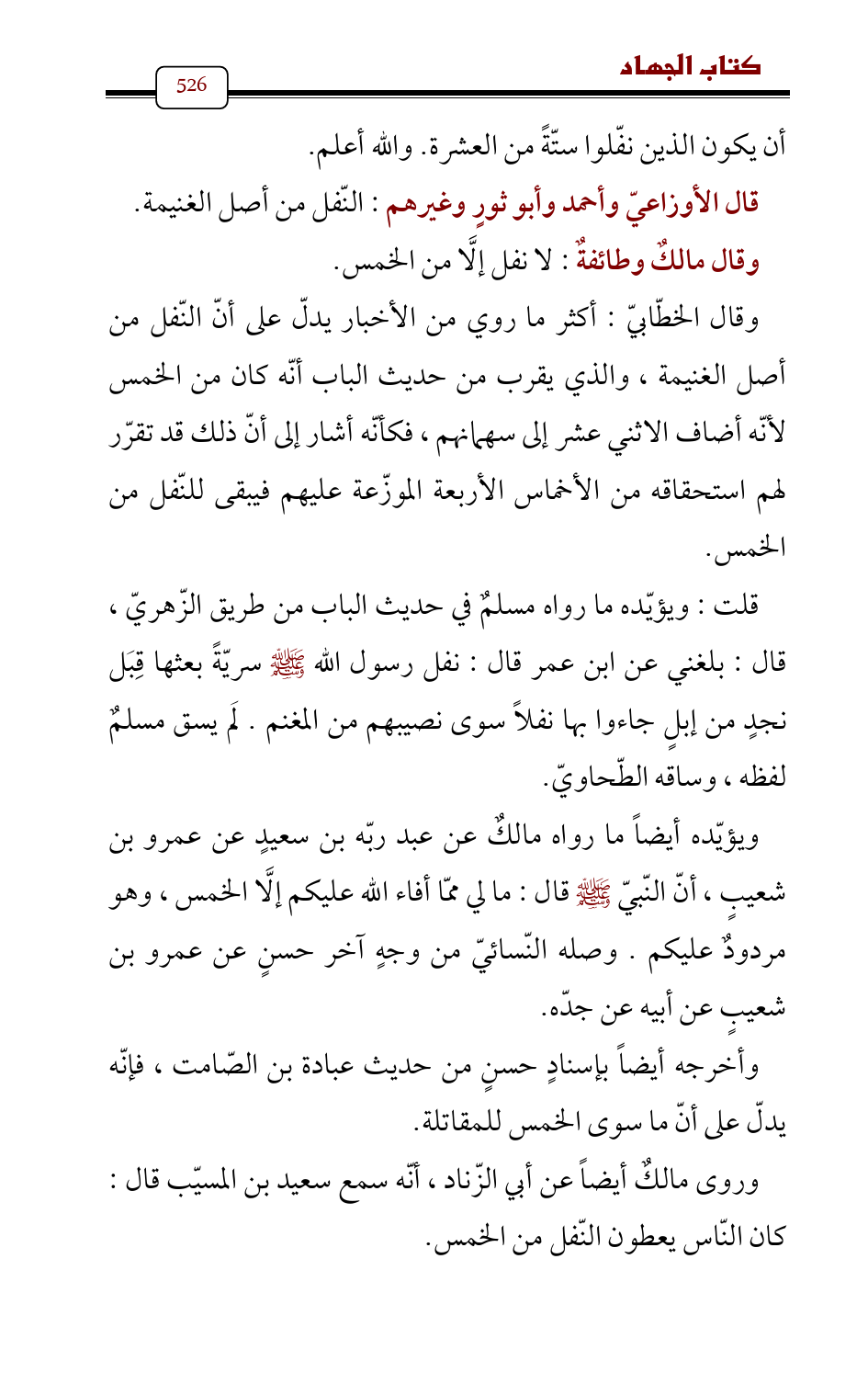 وأخرجه أيضاً بإسنادٍ حسنٍ من حديث عبادة بن الصّامت , فإنّه يدلّ على أنّ ما سوى الخمس للمقاتلة.