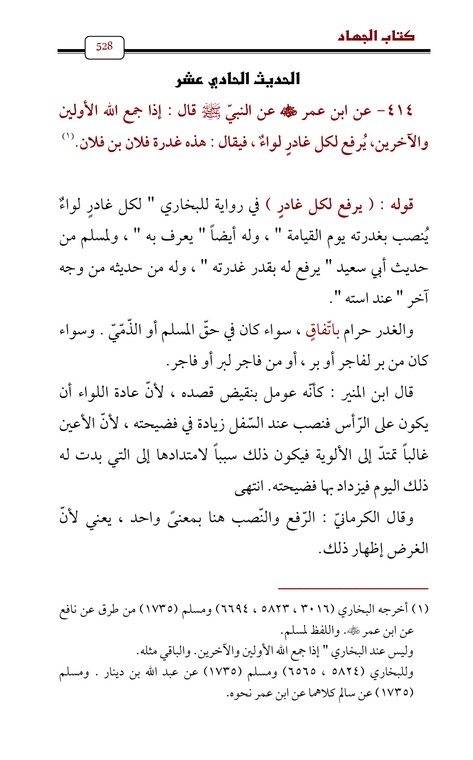 414 - عن ابن عمر - رضي الله عنه - عن النبيّ - صلى الله عليه وسلم - قال: إذا جمع الله الأولين والآخرين، يُرفع لكل غادرٍ لواءٌ، فيقال: هذه غدرة فلان بن فلان. (¬1)