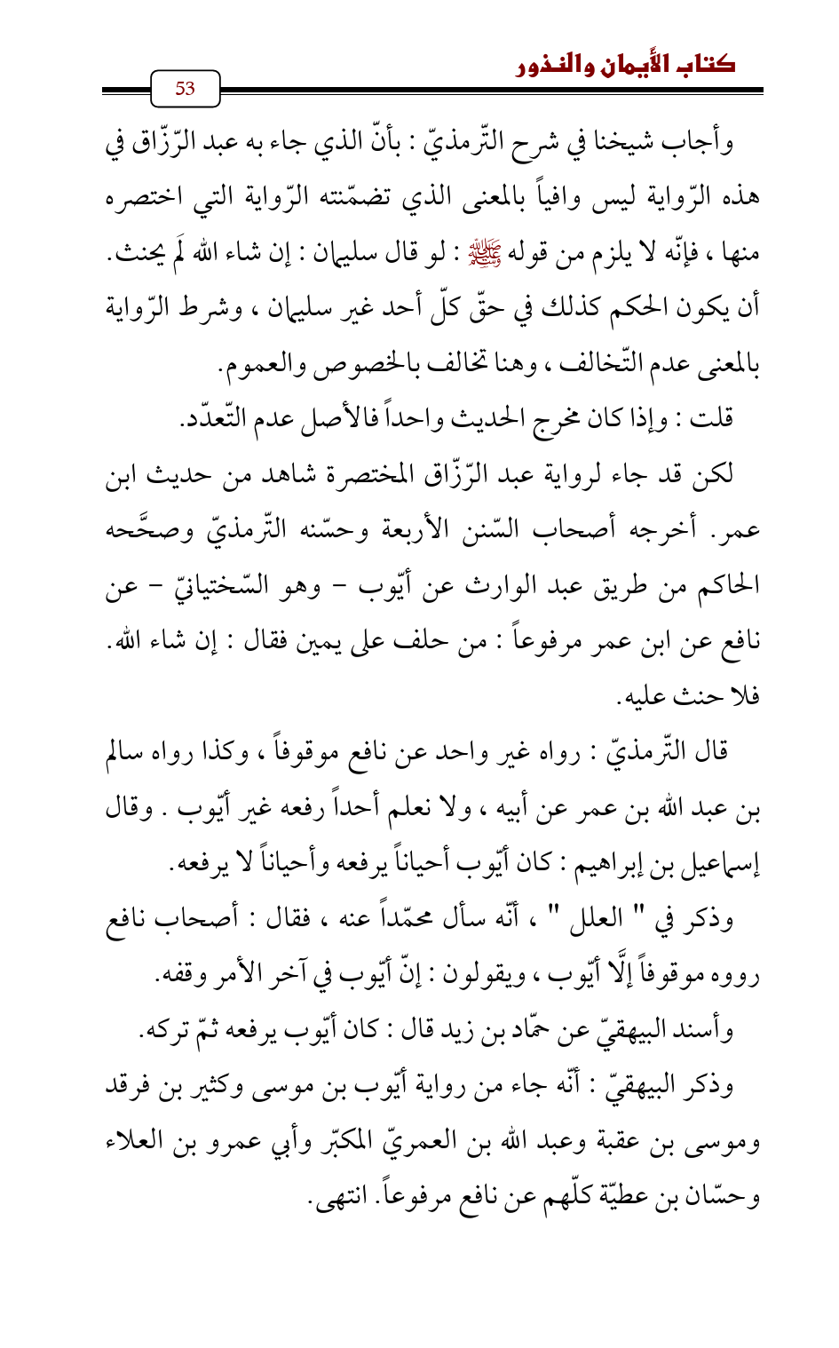 لكن قد جاء لرواية عبد الرّزّاق المختصرة شاهد من حديث ابن عمر. أخرجه أصحاب السّنن الأربعة وحسّنه التّرمذيّ وصحَّحه الحاكم من طريق عبد الوارث عن أيّوب - وهو السّختيانيّ - عن نافع عن ابن عمر مرفوعاً: من حلف على يمين فقال: إن شاء الله. فلا حنث عليه.