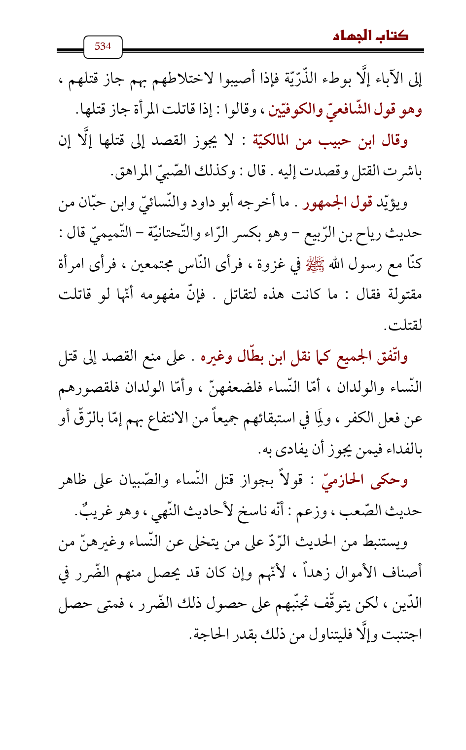 ويؤيّد قول الجمهور. ما أخرجه أبو داود والنّسائيّ وابن حبّان من حديث رياح بن الرّبيع - وهو بكسر الرّاء والتّحتانيّة - التّميميّ قال: كنّا مع رسول الله - صلى الله عليه وسلم - في غزوة، فرأى النّاس مجتمعين، فرأى امرأة مقتولة فقال: ما كانت هذه لتقاتل. فإنّ مفهومه أنّها لو قاتلت لقتلت.