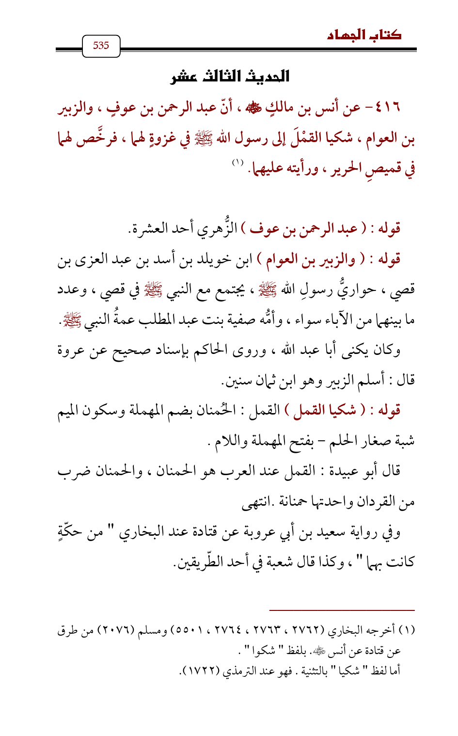 416 - عن أنس بن مالكٍ - رضي الله عنه - , أنّ عبد الرحمن بن عوفٍ، والزبير بن العوام، شكيا القمْلَ إلى رسول الله - صلى الله عليه وسلم - في غزوةٍ لهما، فرخَّص لهما في قميصِ الحرير، ورأيته عليهما. (¬1)