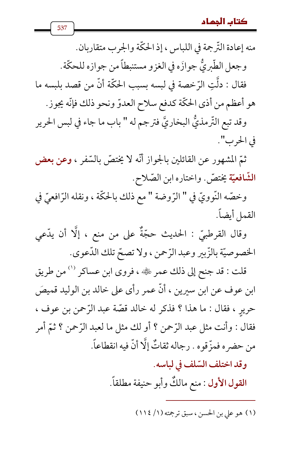 قلت: قد جنح إلى ذلك عمر - رضي الله عنه - , فروى ابن عساكر (¬1) من طريق ابن عوف عن ابن سيرين , أنّ عمر رأى على خالد بن الوليد قميصَ حريرٍ , فقال: ما هذا؟ فذكر له خالد قصّة عبد الرّحمن بن عوف , فقال: وأنت مثل عبد الرّحمن؟ أو لك مثل ما لعبد الرّحمن؟ ثمّ أمر من حضره فمزّقوه. رجاله ثقاتٌ إلَّا أنّ فيه انقطاعاً.