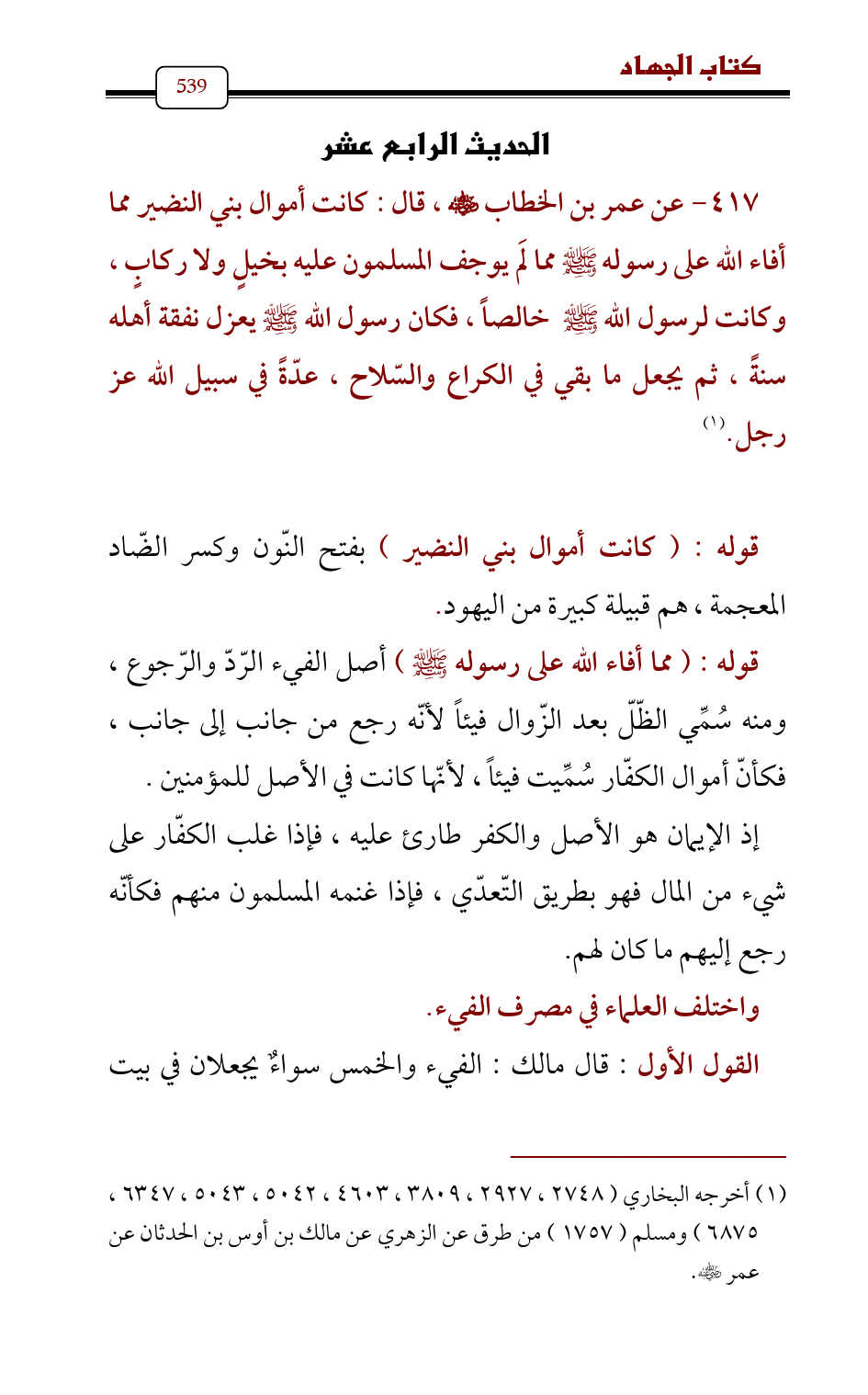 (¬1) أخرجه البخاري (2748 , 2927، 3809، 4603، 5042، 5043، 6347، 6875) ومسلم (1757) من طرق عن الزهري عن مالك بن أوس بن الحدثان عن عمر - رضي الله عنه -.
